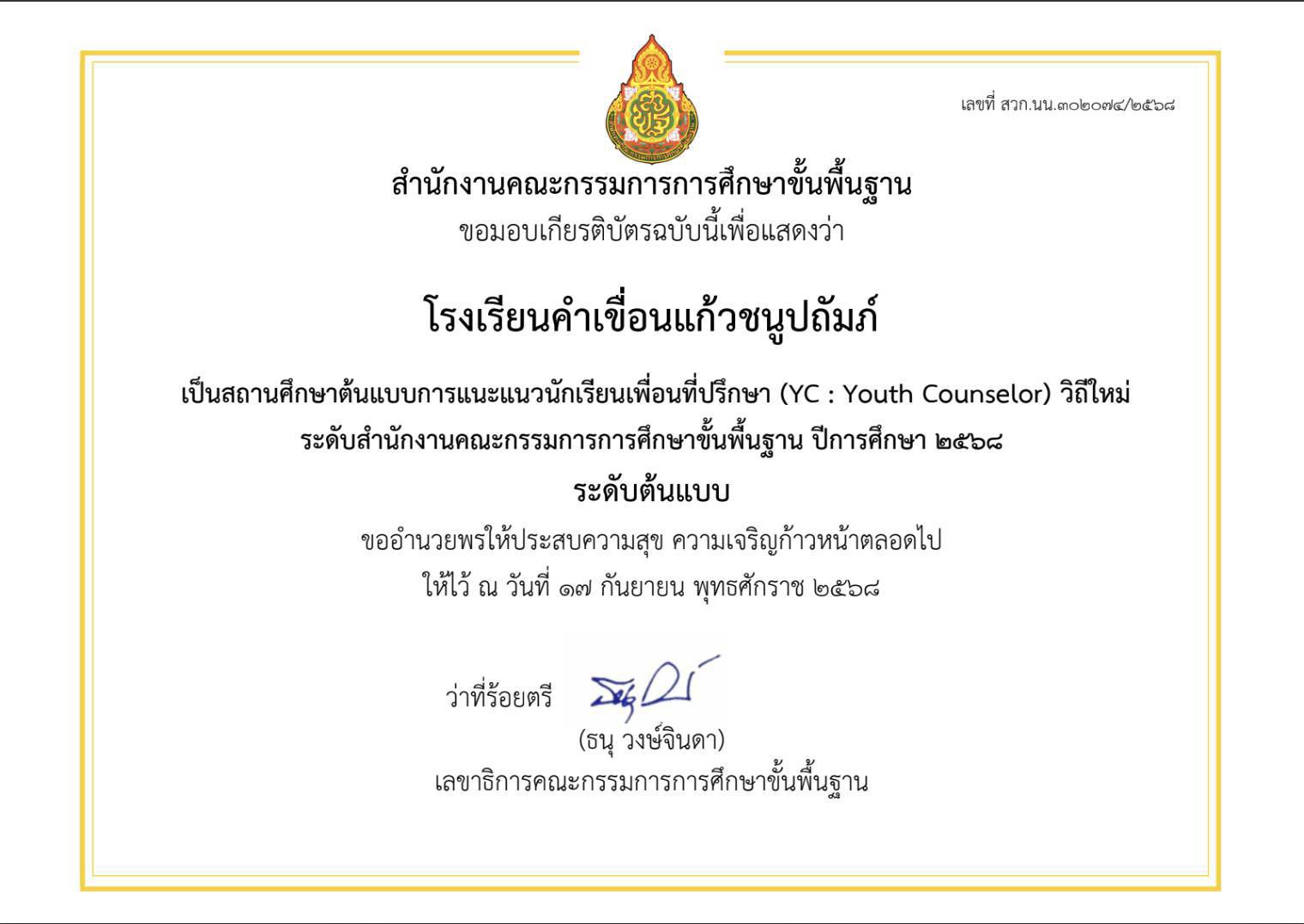 โรงเรียนคำเขื่อนแก้วชนูปถัมภ์ ได้รับ เกียรติบัตรเป็นสถานศึกษาต้นแบบการแนะแนวนักเรียนเพื่อนที่ปรึกษา (YC : Youth Counselor) วิถีใหม่ ระดับสำนักงานคณะกรรมการการศึกษาขั้นพื้นฐาน ประจำปีการศึกษา 2568