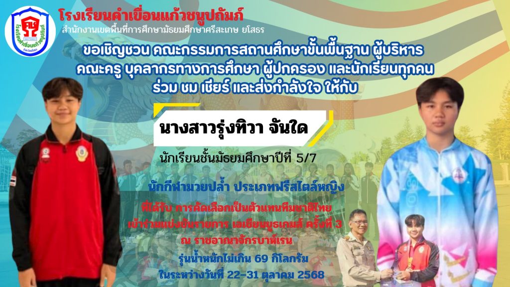 โรงเรียนคำเขื่อนแก้วชนูปถัมภ์ ขอเชิญชวน คณะกรรมการสถานศึกษาขั้นพื้นฐาน ผู้บริหาร คณะครู บุคลากรทางการศึกษา ผู้ปกครอง และนักเรียนทุกคน ร่วม ชม เชียร์ และส่งกำลังใจ ให้กับ นางสาวรุ่งทิวา จันใด นักเรียนชั้นมัธยมศึกษาปีที่ ๕/๗ โรงเรียนคำเขื่อนแก้วชนูปถัมภ์ นักกีฬามวยปล้ำ ตัวแทนทีมชาติไทย เข้าร่วมการแข่งขัน เอเชียนยูธเกมส์ ครั้งที่ ๓ ณ ราชอาณาจักรบาห์เรน ในรุ่นน้ำหนักไม่เกิน ๖๙ กิโลกรัม ระหว่างวันที่ ๒๒ – ๓๑ ตุลาคม พ.ศ. ๒๕๖๘
