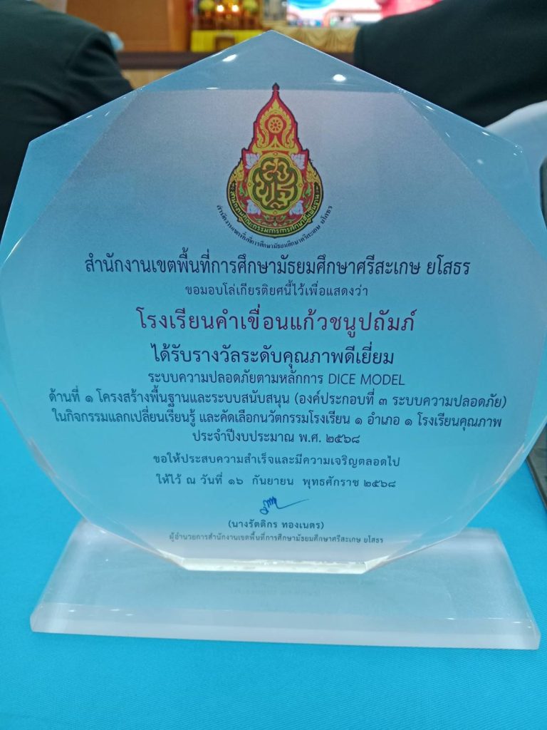 วันที่ ๓๑ ตุลาคม ๒๕๖๘ นายชาติชาย สิงห์พรหมสาร ผู้อำนวยการโรงเรียนคำเขื่อนแก้วชนูปถัมภ์ มอบหมายให้นางสาวพัชราวดี บุญมาก รองผู้อำนวยการกลุ่มบริหารวิชาการ นำคณะครูผู้แทนโรงเรียน เข้ารับโล่รางวัล “ระดับคุณภาพดีเยี่ยม” ด้านระบบความปลอดภัยตามหลักการ DICE MODEL ในด้านที่ ๑ โครงสร้างพื้นฐานและระบบสนับสนุน (องค์ประกอบที่ ๓ ระบบความปลอดภัย)