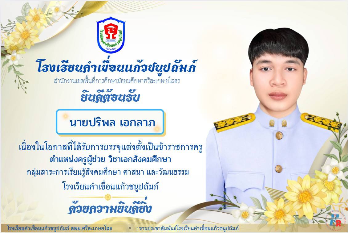 ขอแสดงความยินดีต้อนรับ นายปริพล เอกลาภ ในโอกาสที่ได้รับการบรรจุและแต่งตั้งให้ดำรงตำแหน่งข้าราชการครู ตำแหน่งครูผู้ช่วย วิชาเอกสังคมศึกษา กลุ่มสาระการเรียนรู้สังคมศึกษา ศาสนา และวัฒนธรรม