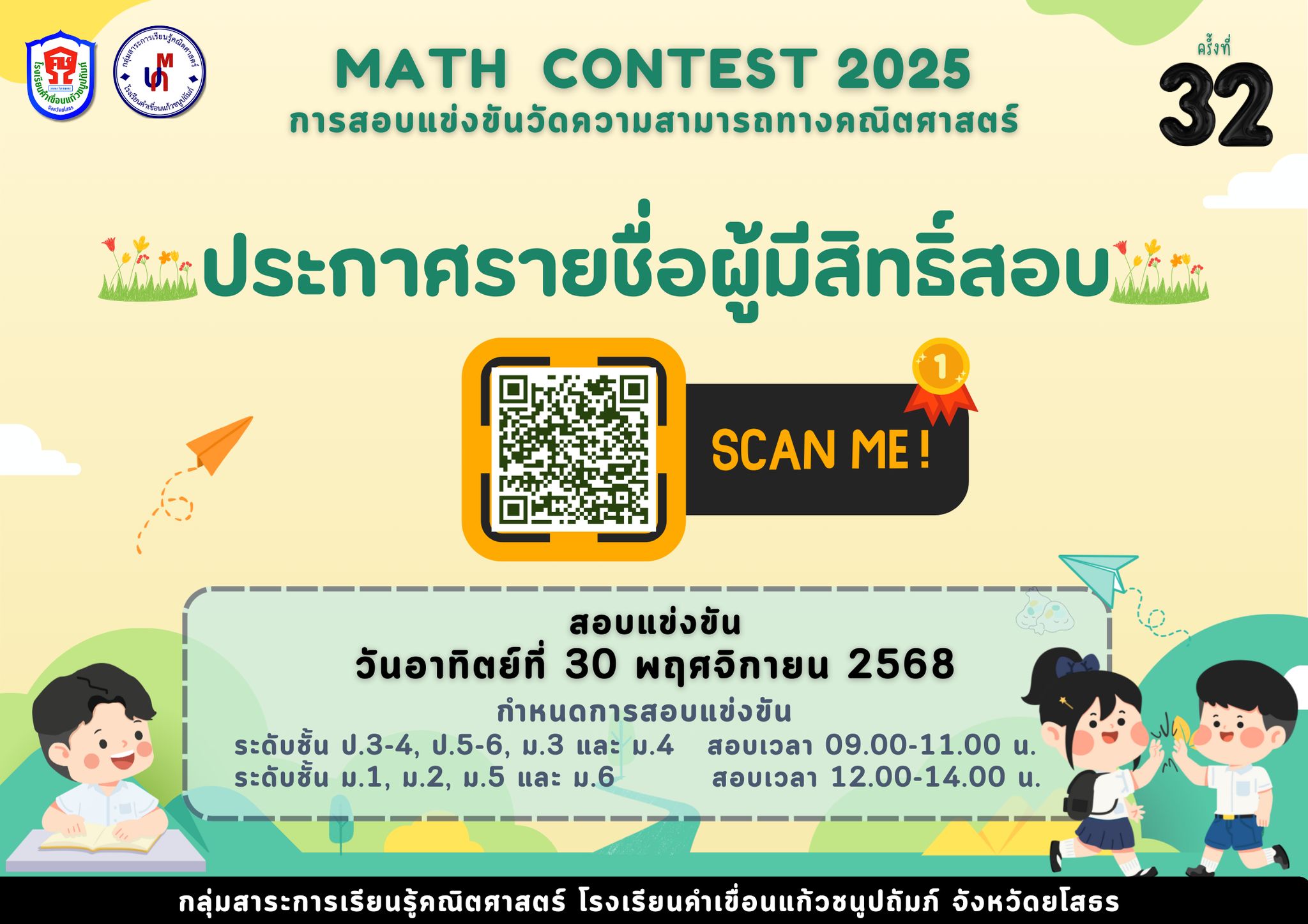 ประกาศรายชื่อผู้เข้าสอบ การสอบแข่งขันวัดความสามารถทางคณิตศาสตร์ ครั้งที่32 (MATH CONTEST 2025)