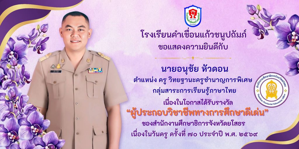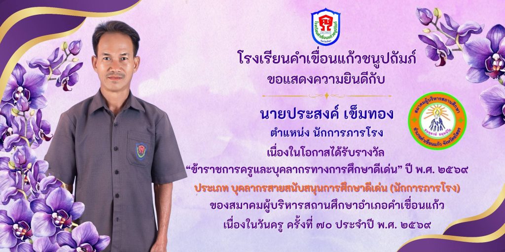 โรงเรียนคำเขื่อนแก้วชนูปถัมภ์ ขอแสดงความยินดีกับผู้บริหาร คณะครู และบุคลากรทางการศึกษา ที่ได้รับรางวัลเชิดชูเกียรติ เนื่องในวันครู ครั้งที่ 70 ประจำปี พ.ศ. 2569 ![]()